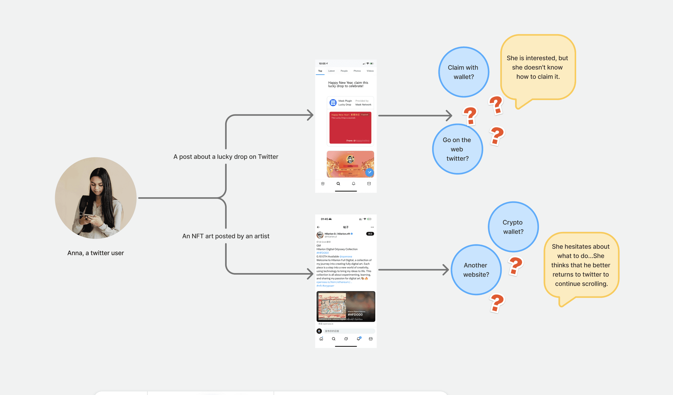 We collected some user feedbacks on their experiences with browsing web3 posts on twitter. For typical web2 users like Anna, they are faced with barriers.