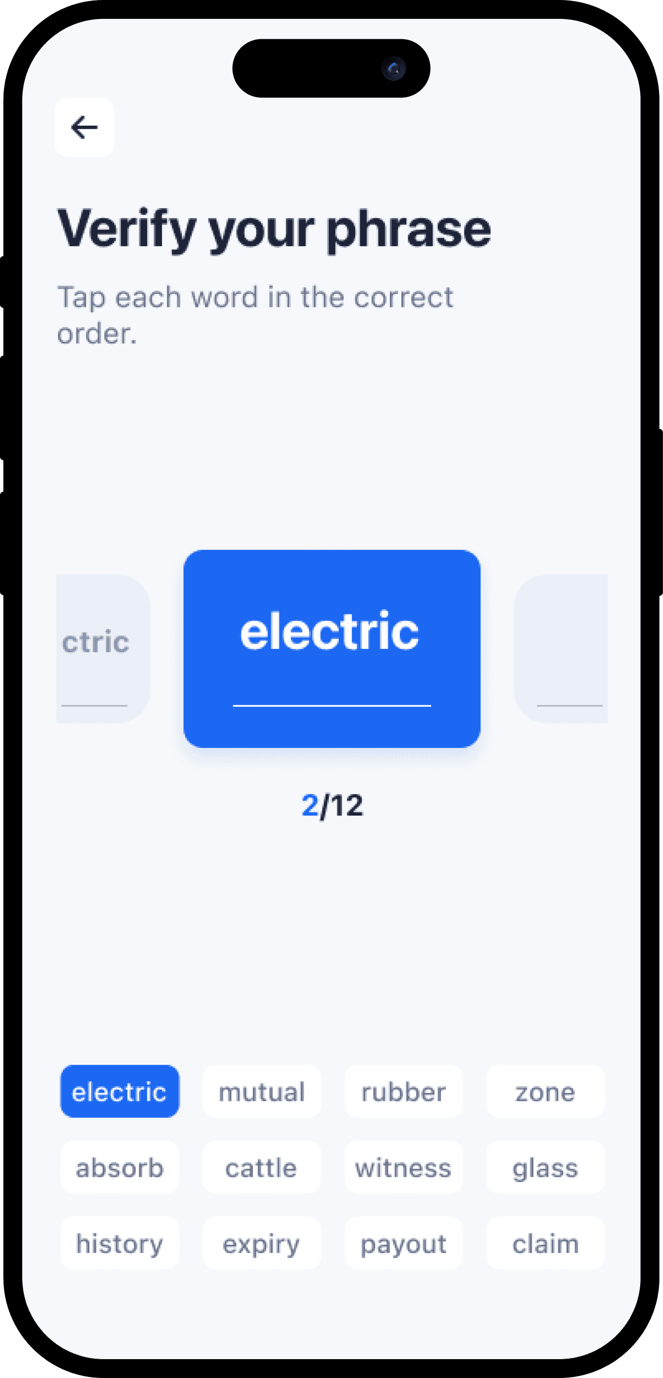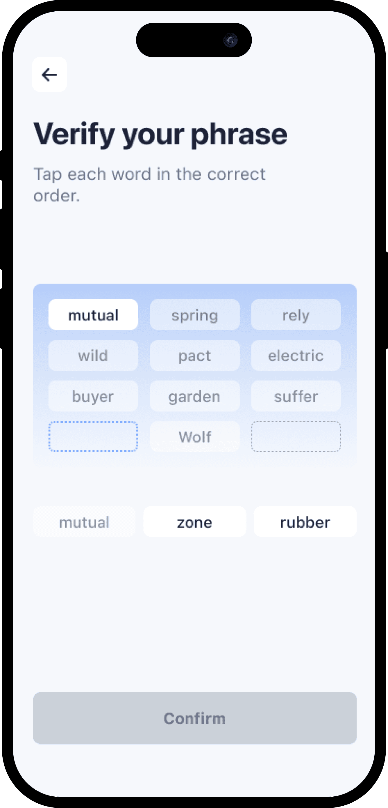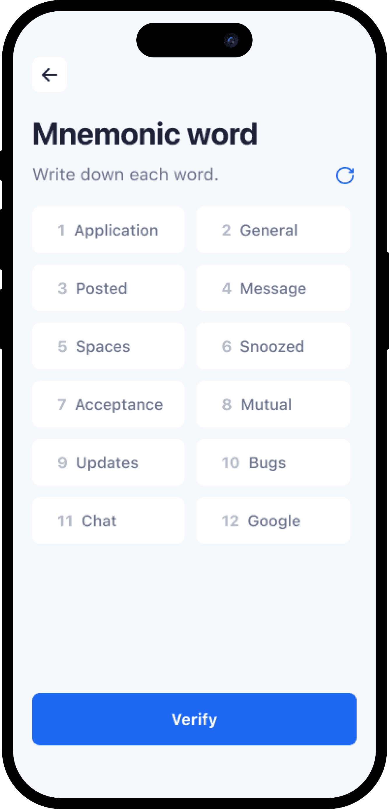 To improve on the first version, we simplified it. Users only need to tap 3 words in the correct order to verify that they have written the words. It shortented the time to verify.